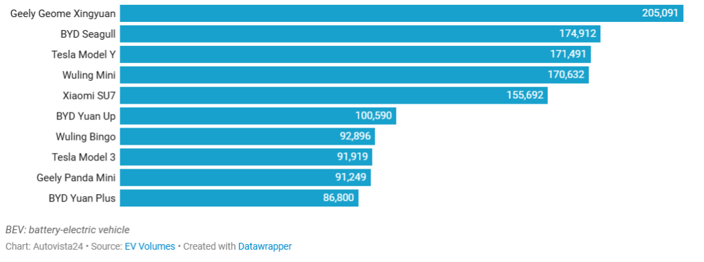 După ce și-a recâștigat primul loc în mai, Geely Geome Xingyuan și-a consolidat avansul în prima jumătate a anului 2025. Modelul, lansat pe piață în septembrie 2024, a înregistrat 205.091 de vânzări între ianuarie și iunie. Aceasta înseamnă că a reprezentat 5,9% din vânzările de BEV din țară.