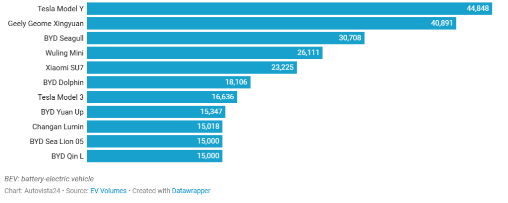 Evoluția vehiculelor BYD, Tesla și Wuling reflectă caracterul competitiv al pieței chineze în acest an. În prima jumătate a anului 2024, Tesla Model Y avea un avans de 50.000 de unități față de BYD Seagull, ceea ce reflecta o competiție între doar două modele acum 12 luni. În 2025, piața este mai deschisă, cu mai multe modele aflate în cursa pentru titlu.