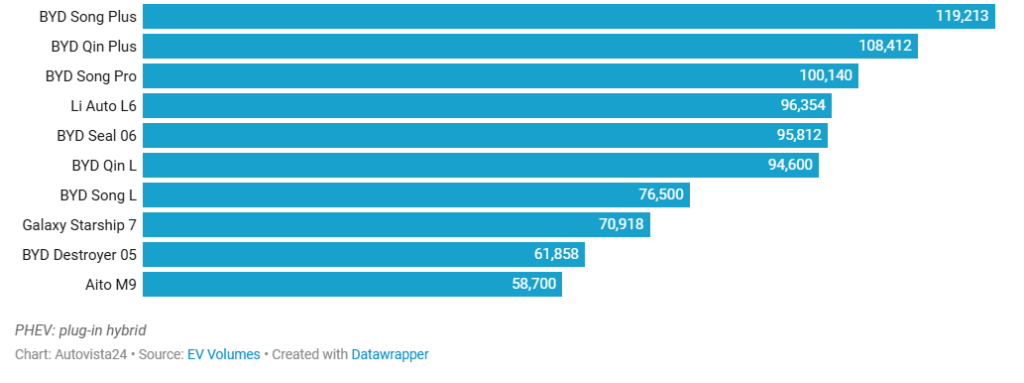 Două modele s-au clasat la egalitate pe locul zece, ambele înregistrând un rezultat record în a patra lună de vânzări. Acestea au fost BYD Sea Lion 05, care și-a făcut debutul în top 10, și BYD Qin L. Ambele au realizat câte 15.000 de livrări în iunie, echivalând cu o cotă de 2,2%.